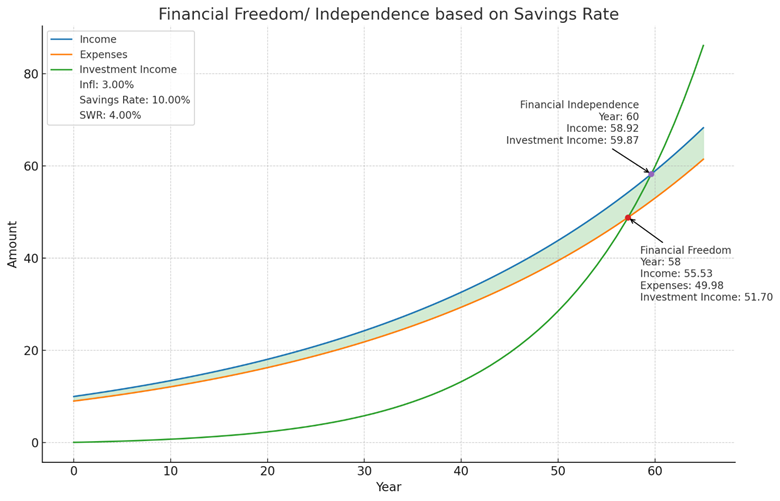- Financial Freedom: ~Year 58 (investment income ≈ 51.70)