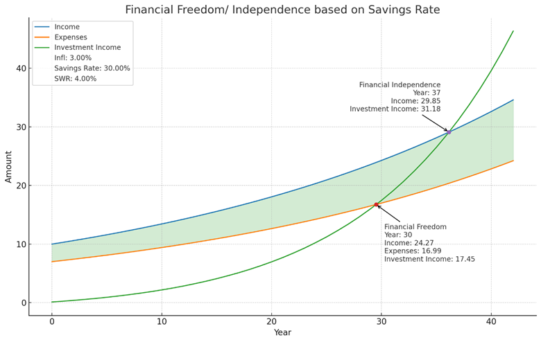 Saving 30% compresses the timeline significantly. This is how ordinary people: coaches, teachers, enlisted folks, small-business owners actually reach freedom. They invest a significant portion of the current earnings into low-cost index fund and let compounding do the rest.