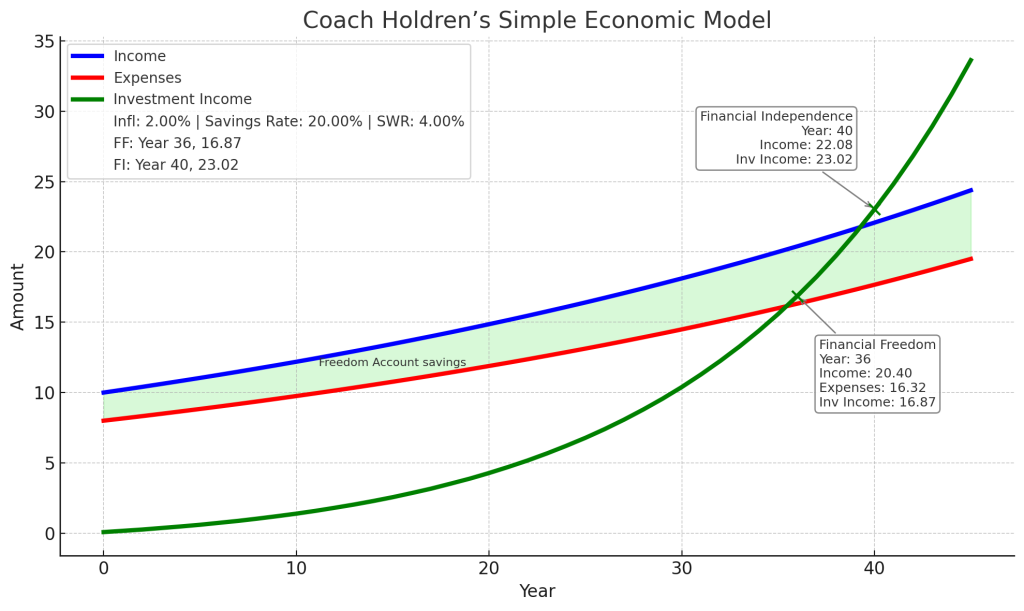 It really doesn’t need to be more complicated than this. The advantage of Coach Holdren’s Simple Economic Model is that it gives you a clear timeline. Plug in your numbers, choose your savings rate (that’s fully under your control), and you’ll see how long it will take to hit: