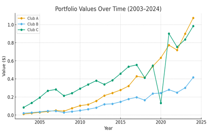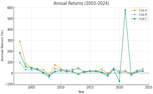 Then came Club C, a side far less predictable. Their strategy was part dividend, part property play — the kind of hybrid approach that looks brilliant when the counterattack lands but leaves the back line dangerously exposed. Some years their surges were breathtaking, as if they were a cup team destined to shock the giants. Other years, they were caught flat, forced into painful retreats, scrambling to rebuild. By the end of 2022, they made a dramatic substitution, selling off the real estate leg of their formation and redeploying fully into equities. It was bold, it was risky, and it gave them moments of thrilling momentum. Yet, as any coach knows, such volatility comes at a cost: consistency.