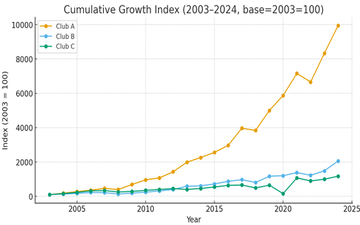 Club A’s line on the graph arcs upward with remarkable steadiness, as though their press never tired, as though compounding itself was their star striker converting every half-chance.